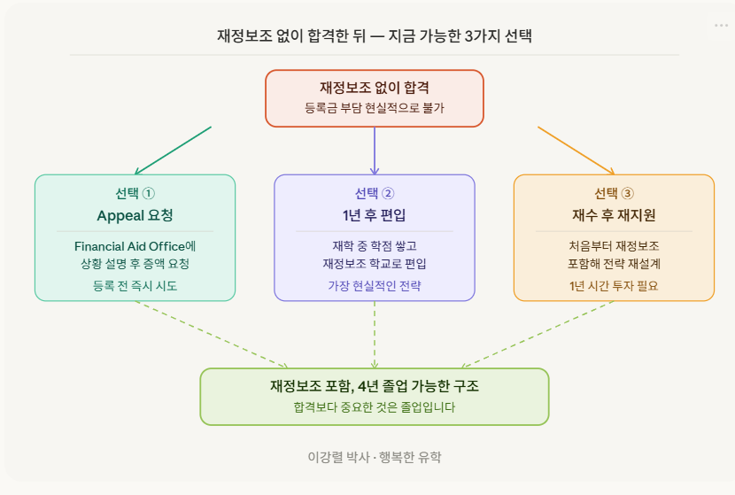 재수는 1년을 통째로 잃는 선택입니다. 편입은 다릅니다. 1년을 다니면서 학점을 쌓고, 재정보조를 제대로 신청해서 다른 학교로 편입하는 전략이 훨씬 현실적입니다. 편입 시 재정보조를 새로 신청할 수 있고, Need-blind 학교나 Merit 장학금이 강한 학교로 방향을 바꿀 수 있습니다.